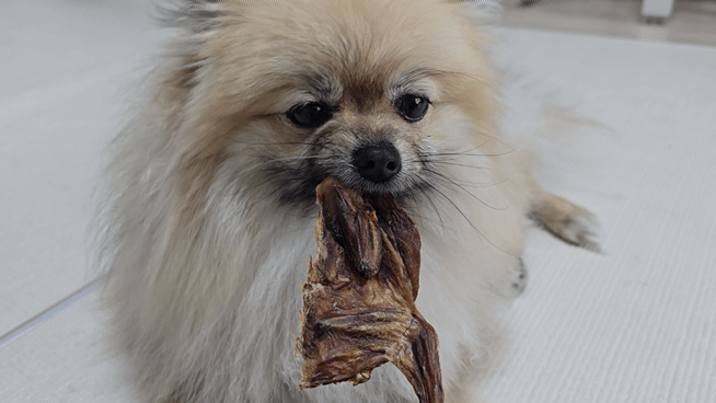 메추리 육포를 자세히 보면 뼈도 그대로 있다는 걸 알 수 있는데요. 보통 튀기거나 구운 치킨 뼈, 생선 뼈 같은 것은 강아지에게 급여하면 위험하지만, 이렇게 강아지 전용 간식으로 가공된 것은 괜찮아요. 강아지가 뼈를 씹는 재미도 있고, 치석도 제거할 수 있다는 장점이 있죠!